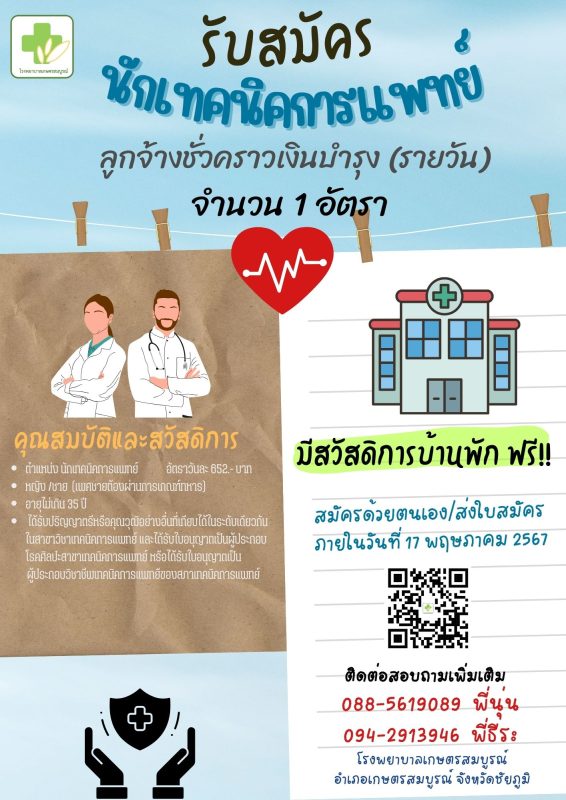 ประกาศรับสมัครลูกจ้างชั่วคราว ตำแหน่ง นักเทคนิคการแพทย์ จำนวน 1 อัตรา รายละเอียด >>>คลิก<<<<