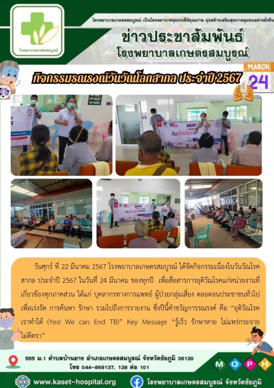 วันศุกร์ ที่ 22 มีนาคม 2567 โรงพยาบาลเกษตรสมบูรณ์ ได้จัดกิจกรรมเนื่องในวันวัณโรคสากล ประจำปี 2567 ในวันที่ 24 มีนาคม ของทุกปี เพื่อสื่อสารการยุติวัณโรคแก่หน่วยงานที่เกี่ยวข้องทุกภาคส่วน ได้แก่ บุคลากรทางการแพทย์ ผู้ป่วยกลุ่มเสี่ยง ตลอดจนประชาชนทั่วไป เพื่อเร่งรัด การค้นหา รักษา รวมไปถึงการรายงาน ซึ่งปีนี้คำขวัญการรณรงค์ คือ “ยุติวัณโรค เราทำได้ (Yes! We can End TB)” Key Message “รู้เร็ว รักษาหาย ไม่แพร่กระจาย ไม่ตีตรา”