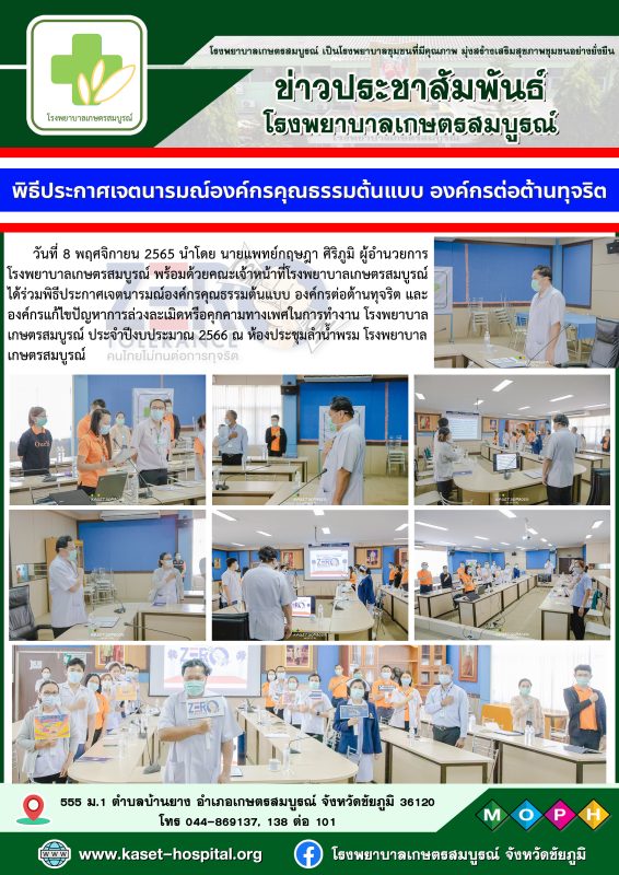 เมื่อวันที่ 8 พฤศจิกายน 2565 นำโดย นายแพทย์กฤษฎา ศิริภูมิ ผู้อำนวยการโรงพยาบาลเกษตรสมบูรณ์ พร้อมด้วยคณะเจ้าหน้าที่โรงพยาบาลเกษตรสมบูรณ์ ได้ร่วมพิธีประกาศเจตนารมณ์องค์กรคุณธรรมต้นแบบ องค์กรต่อต้านทุจริต และองค์กรแก้ไขปัญหาการล่วงละเมิดหรือคุกคามทางเพศในการทำงาน โรงพยาบาลเกษตรสมบูรณ์ ประจำปีงบประมาณ 2566 ณ ห้องประชุมลำน้ำพรม โรงพยาบาลเกษตรสมบูรณ์