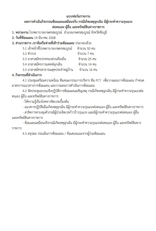 ในวันที่ 11 เมษายน 2568 เวลา 08.30 น. นายแพทย์กฤษฎา ศิริภูมิ ผู้อำนวยการโรงพยาบาลเกษตรสมบูรณ์ มอบหมายให้นางวิชชุดา ชินกิ่ง หัวหน้ากลุ่มงานการพยาบาล และคณะเจ้าหน้าที่ เข้าร่วมพิธีเปิดศูนย์ปฏิบัติการป้องกันและลดอุบัติเหตุทางถนนช่วงเทศกาลสงกรานต์ พ.ศ. 2568 ณ บริเวณจุดตรวจหลักจุดที่ 2 หน้าสำนักงานเทศบาลตำบลบ้านเป้า